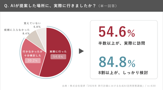 AIと対話して旅行計画を立てた630人に「AIが提案した場所に実際に行きましたか?」と聞いたところ、54.6%(344人)が「実際に行った」と回答。さらに30.2%が「行かなかったが候補には入っていた」と答えており、合わせて84.8%がAIの提案を検討対象にしていました。