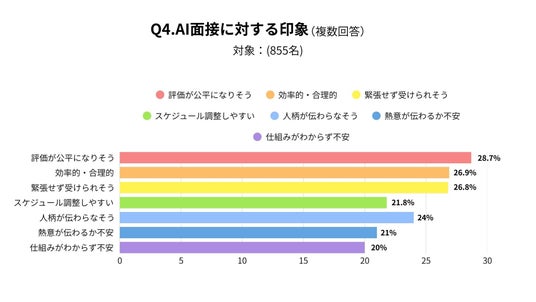 AI面接に対する印象については、「評価が公平になりそう」(28.7%)、「効率的・合理的だと思う」(26.9%)「緊張せず受けられそう」(26.8%)、といったポジティブな意見が上位を占めました。