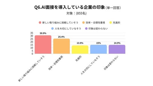 また、AI面接を導入している企業に対しては、「新しい取り組みに挑戦していそう」(30.9%)「効率や合理性を重視している」(25.4%)といった好意的な印象が多く、「人を大切にしていなさそう」と感じる人は14.9%にとどまりました。