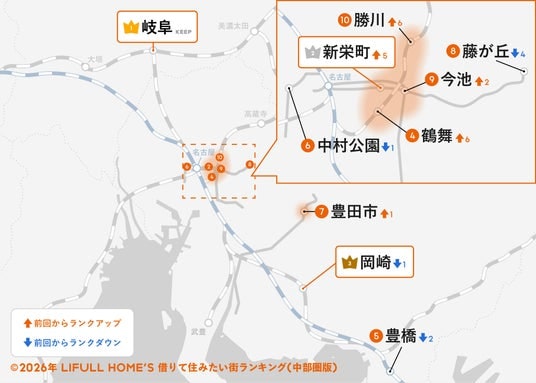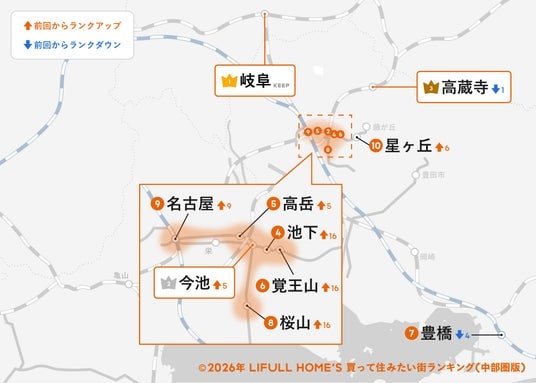「2026年 LIFULL HOME'S みんなが探した!借りて住みたい街ランキング(中部圏版)」は、8年連続して「岐阜」が1位となりました。2019年以降1度もトップを譲らず、中部圏では不動の人気を確立しています。