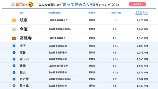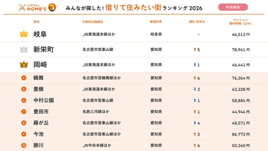 事業を通して社会課題解決に取り組む、株式会社LIFULL(本社:東京都千代田区、代表取締役社長:伊東祐司、東証プライム:2120)が運営する不動産・住宅情報サービス「LIFULL HOME'S(ライフルホームズ)」は、「2026年 LIFULL HOME'S みんなが探した!住みたい街ランキング(中部圏版)」を発表しました。
