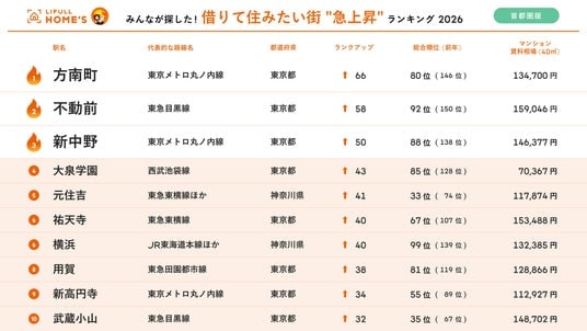 TOP100に入った駅を対象に、前回からのランクアップ数を集計した「2026年 LIFULL HOME'S みんなが探した!借りて住みたい街 急上昇ランキング(首都圏版)」。最もランクを上昇させたのは、66ランクアップ(146位→80位)の東京メトロ丸ノ内線「方南町」でした。例年160位前後で安定推移していましたが、今回は一気にTOP100入りを果たしました。2位は58ランクアップの「不動前」、3位は50ランクアップの「新中野」が続いています。