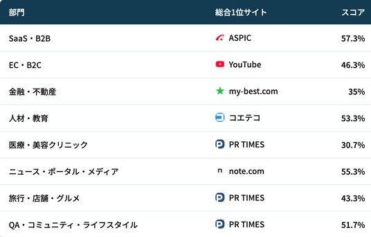 業界団体(ASPIC)、動画プラットフォーム(YouTube)、比較メディア(my-best.com)、教育メディア(コエテコ)、プレスリリース配信(PR TIMES)、UGCプラットフォーム(note.com)--AIが信頼する情報源は業界ごとに異なります。