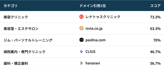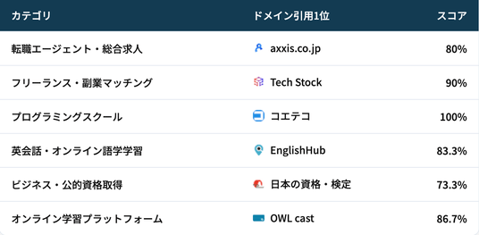 カテゴリごとに設計した多数のプロンプトを4つのAIプラットフォームに投げ、各ドメインが引用元として1回でも表示されたプロンプトの割合をスコアとしています。たとえばスコアが86.7%であれば、そのカテゴリに関する質問をAIに投げたとき、約9割の確率で引用元として表示されるということです。