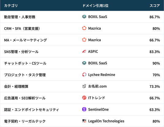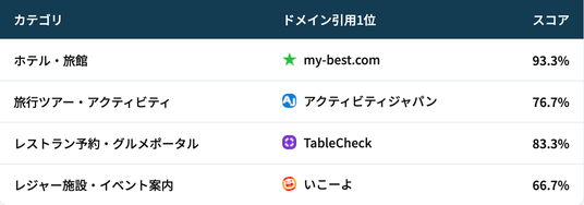 部門全体の総合スコアは、全カテゴリのスコアを平均して算出しています。出現しないカテゴリは0%として計算するため、幅広いカテゴリで安定して引用されるサイトほど上位にランクインします。