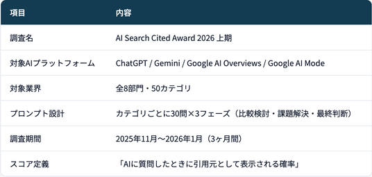 AI Search Cited Awardは、業界・カテゴリーごとに、AIが最も信頼し引用するメディアと企業をスコアリング・ランキング化し、半期ごとに表彰するアワードです。