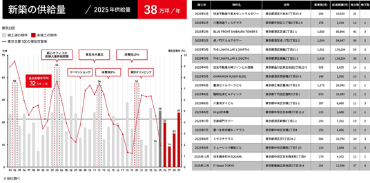2025年の東京主要5区オフィスビル新規供給量は約38万坪であり、2024年の約16万坪と比較すると2倍以上の供給となった。オフィス需要の高まりによる既存空室の解消が進み、2025年に竣工した物件についても堅調に埋まっていったことで、マーケットにとっては大きな回復を果たした1年となった。
