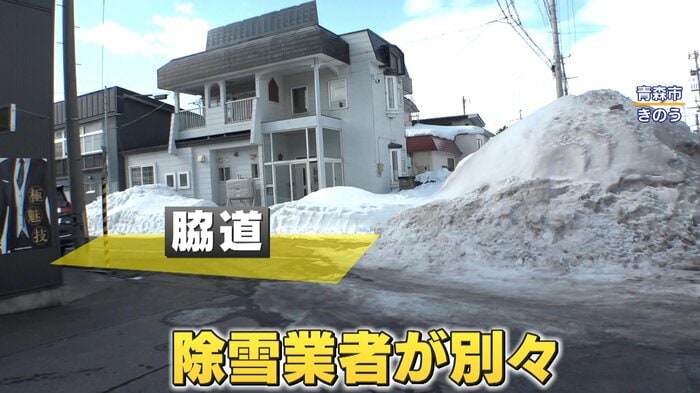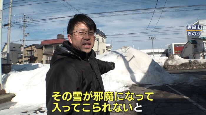 この道は業者さんが2つありまして。ここの業者さんの言い分としては、ここの角の雪っていうのは、幹線(道路)の雪なので、その雪が邪魔になって入ってこられないと。