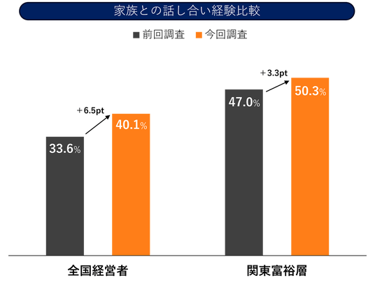 家族との話し合い経験は、全国経営者で 40.1%(+6.5pt)、関東富裕層で 50.3%(+3.3pt) と前回調査から増加しました。コミュニケーション面で前進は見られるものの、依然として半数近くが話し合い未経験であり、心理的抵抗や情報開示への不安が課題となっています。