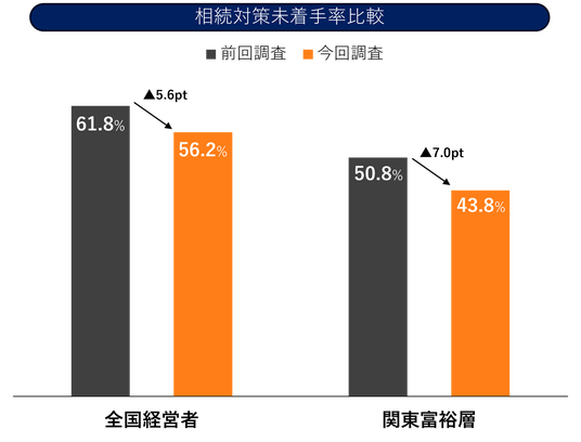 1. 5割超(50.7%)が相続対策に未着手相続対策を「何もしていない」と回答した割合は、全国経営者で 56.2%、関東富裕層で 43.8%。両調査を合算すると 50.7% に達し、改善傾向はあるものの依然として未着手層が半数を超える高水準であることが明らかになりました。