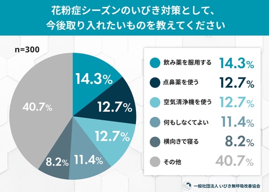 - その他:40.7%(鼻腔拡張テープを使う:8.1%、鼻うがいをする:7.7%、加湿器を使う:7.7% など)