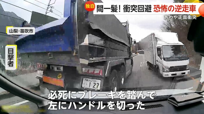 山梨・笛吹市の峠道で、オレンジ色のセンターラインを越えて逆走してきた白いトラックとあわや正面衝突という瞬間が捉えられた。