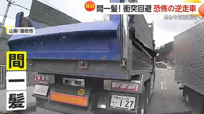 山梨・笛吹市でカメラが捉えたのは、逆走車とあわや正面衝突の瞬間だ。