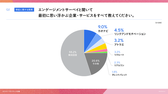 「Q2. エンゲージメントサーベイと聞いて最初に思い浮かぶ企業・サービスをすべて教えてください。(自由回答)」(n=200)と質問したところ、「カオナビ」が9.0%、「リンクアンドモチベーション」が4.5%、「アトラエ」と「リクルート」が3.2%という回答となりました。