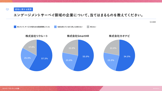 「Q1. エンゲージメントサーベイ領域の企業について、当てはまるものを教えてください。」(n=200)と質問したところ、「知っていて、サービス内容もある程度理解している」および「名前は知っているが、詳しくは知らない」と回答した割合は、株式会社リクルートは83.5%、株式会社SmartHRと株式会社カオナビが78.0%で同率となりました。