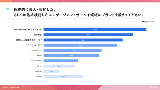 「Q7. 最終的に導入・契約した、もしくは最終検討したエンゲージメントサーベイ領域のブランドを教えてください。(複数回答)」(n=200)と質問したところ、「SmartHRタレントマネジメント」が39.5%、「カオナビ」が34.0%、「HRBrain 組織診断サーベイ」が30.5%という回答となりました。