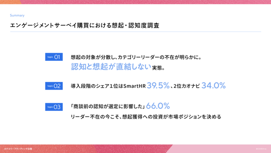 今回のエンゲージメントサーベイ領域の調査結果は、これまでのカテゴリーとは全く異なる、ある種の混沌とした実態を突きつけています。一言で言えば、「圧倒的なカテゴリーリーダーが不在で、顧客の脳内シェアが奪い合いになっている」という状況です。