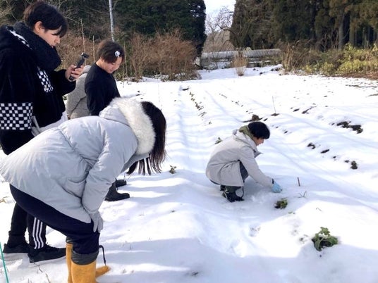 雪の中から小さなかぶを収穫する様子