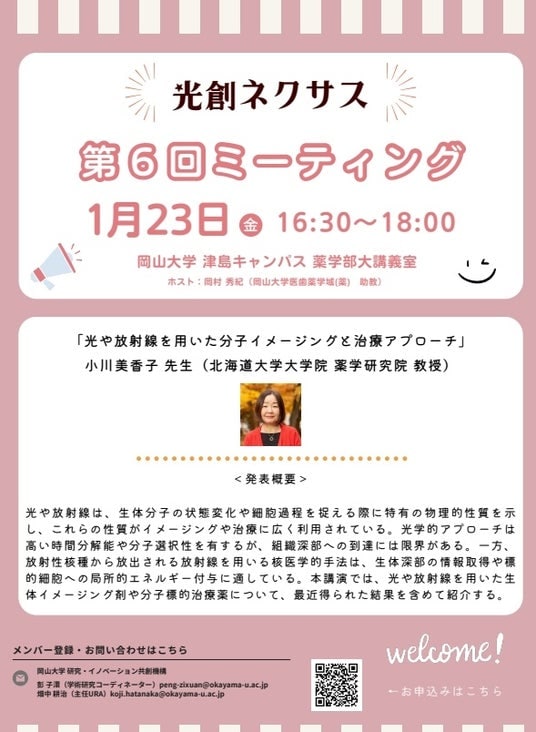 国立大学法人岡山大学(本部:岡山市北区、学長:那須保友)は2026年1月23日、本学津島キャンパスの薬学部大講義室において、第5回に続き「光創ネクサス」第6回ミーティングを開催しました。