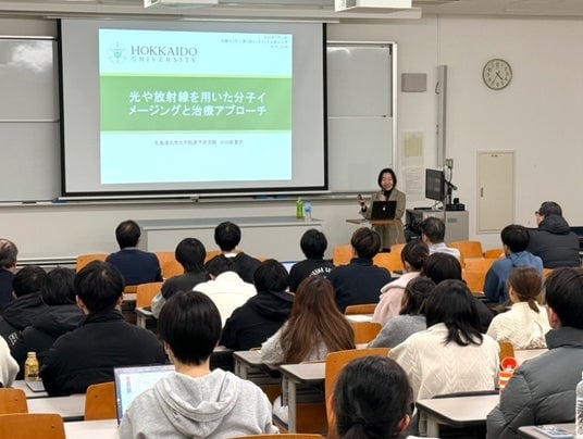 ミーティングは、世話人を務める学術研究院医歯薬学域(薬)の岡村秀紀助教による開会あいさつで始まりました。続いて、北海道大学大学院薬学研究院の小川美香子教授が、「光や放射線を用いた分子イメージングと治療アプローチ」と題して講演しました。小川教授は、光や放射線を用いた生体イメージング剤や分子標的治療薬について、最近得られた研究成果を交えながら紹介しました。講演後には質疑応答が行われ、参加者との間で充実した議論が交わされました。学生からも積極的な質問が寄せられ、新しい知識や視点を学ぶ貴重な機会となりました。