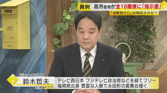 ▼鈴木哲夫氏「ある大臣に確認したら『中身はその通りでした』と。この指示書を見ていくと消費税減税について高市さんが指示出したかというと、 全ての閣僚に対しては『飲食料品に関わる消費税減税や給付付き税額控除の検討を含めた物価高対策、これに取り組む』と表現しています」