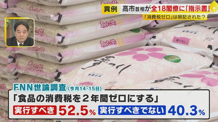 衆院選の後に行われたFNNの世論調査では「食料品の消費税率2年間ゼロを実行すべき」と回答した人が過半数の52.5%に達している一方で「実行すべきではない」と回答した人も40.3%となっている。