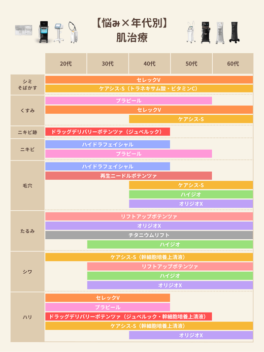 そこで、肌悩みと年代に合わせ、当院(リゼクリニック/メンズリゼ)で扱っている肌治療の目安をチャート(図解)にまとめました。