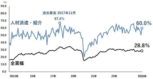 非正社員の不足を感じている企業の割合を業種別にみると、「人材派遣・紹介」が60.0%(前年同月比 -5.3pt)で最も高かった。2025年7月以来のトップとなり、企業からは「人手不足により、採用コストが上がっている」(労働者派遣、群馬県)といった声が聞かれた。