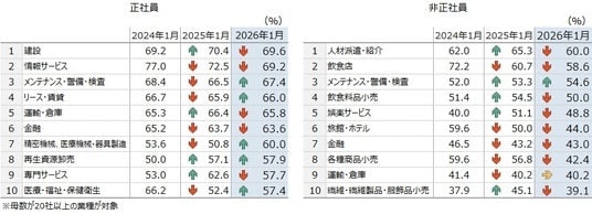 非正社員では、「人材派遣・紹介」が2025年7月以来のトップとなったが、唯一6割となった。これまで上位にランクしていた「飲食店」「旅館・ホテル」など改善傾向にある。一方で、「メンテナンス・警備・検査」は高水準で推移しており、正社員・非正社員ともに前年同月から上昇している。企業からは「人材確保が困難な状況が継続し、売り上げに影響している。従業員の高齢化も進み、今後もこのような状況は継続していくものと推察される」(警備、新潟県)といった声が聞かれた。