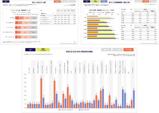 ファンの情報接触、観戦・応援スタイル、支出行動データから、ファンを意識・行動の両面から可視化した資料により分析することができます。