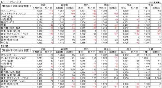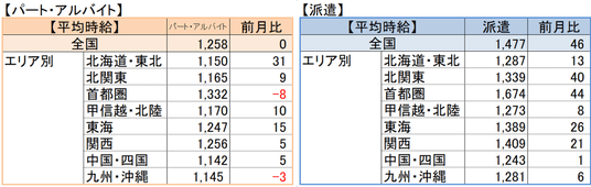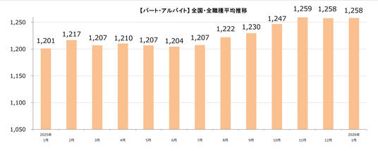 【パート・アルバイト】全国・全職種平均時給は1,258円。前月比±0円。前年同月比+57円。