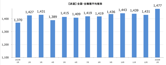 【派遣】全国・全職種平均時給は1,477円。前月比+46円。前年同月比+107円。
