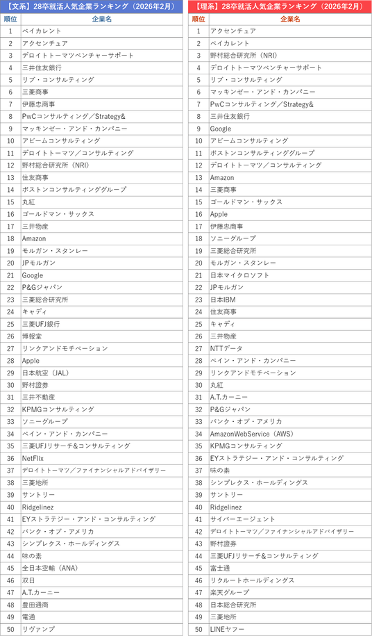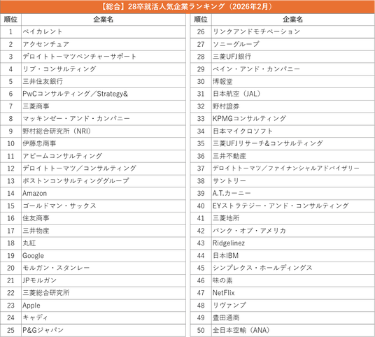 「世界で挑戦できる人材を育み、未来を創る」を掲げ、ユーザーファーストを追求したキャリアプラットフォーム「外資就活ドットコム」を運営する株式会社ハウテレビジョン(本社:東京都港区、代表取締役:音成洋介)の外資就活総合研究所は、「2028年卒 就活人気企業ランキング(2026年2月)」を発表します。本ランキングは調査時点における状況を示すもので、採用活動の時期によって学生の関心が移り変わるため、複数回に分けて調査を行っています。今回は2028年卒ランキングの初回調査として、2026年2月1日時点の企業フォロー数(累計)を集計しました。この時期は、学部生では主に大学2年生が対象となり、情報収集や応募準備が始まりつつある段階です。そのため、知名度の高い企業や早期から情報発信を行ってきた企業にフォローが集まりやすい傾向が見られました。