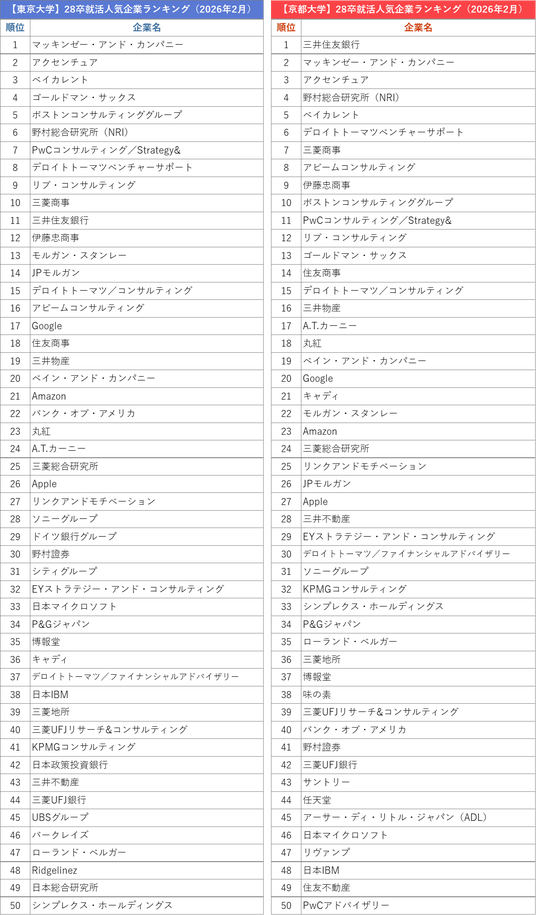 ・大学ごとの1位を見ると、東京大学がマッキンゼー・アンド・カンパニー、京都大学が三井住友銀行、早稲田大学がベイカレント、慶應義塾大学がアクセンチュアで、大学ごとに異なる結果となった