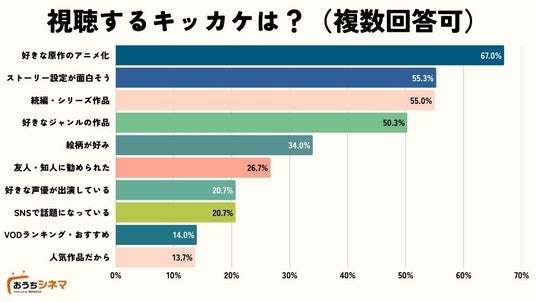 新しいアニメを視聴するきっかけとしては、「好きな原作(漫画・ラノベ・ゲームなど)のアニメ化」が67.0%で圧倒的1位となりました。