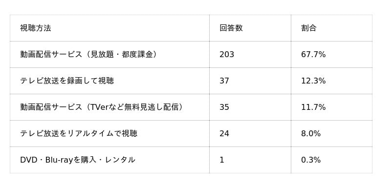 「普段、アニメをどのような方法で視聴することが一番多いですか?」と質問したところ、「動画配信サービス(見放題・都度課金)」が67.7%(203人)と最も多い結果となりました。