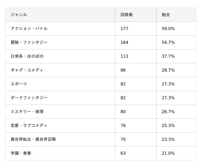 3位には「日常系・ほのぼの」(37.7%)がランクインし、激しいバトル作品だけでなく、癒し系の作品にも根強い人気があることがわかりました。
