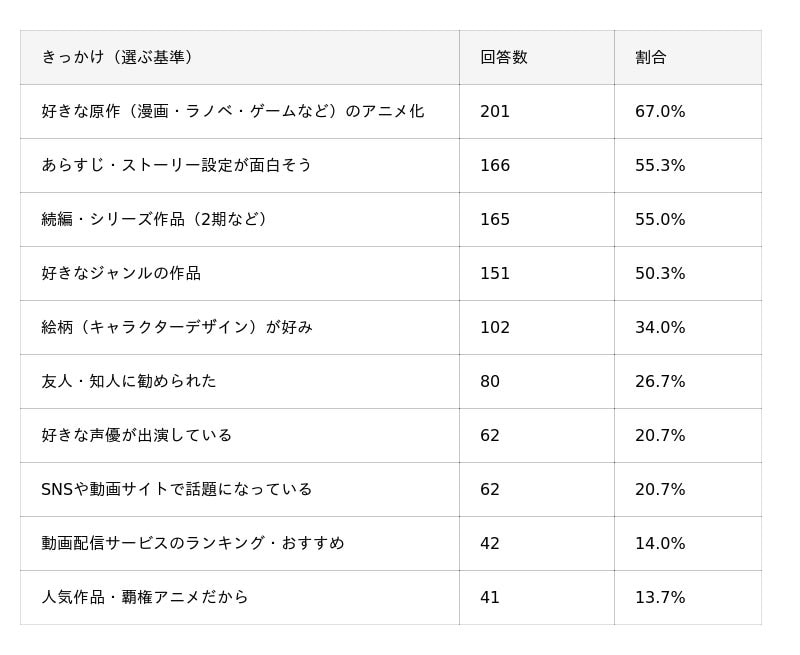 作品選びにおいては原作への信頼やストーリーへの期待が最大の決め手となっており、今後もメディアミックス展開がアニメ業界の成長を牽引していくと考えられます。