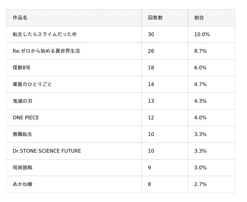 次シーズンに放送・配信予定の作品で視聴を予定しているものとしては、「転生したらスライムだった件」が10.0%(30人)で1位、「Re:ゼロから始める異世界生活」が8.7%(26人)で2位となりました。