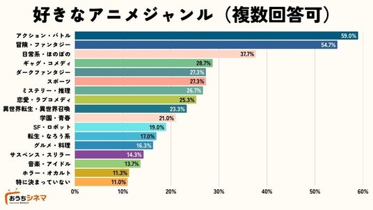ジャンル別では「アクション・バトル」や「冒険・ファンタジー」といった王道ジャンルが引き続き強い人気を誇る一方、「日常系・ほのぼの」のような癒し系作品も約4割の支持を得ており、視聴者の嗜好が多様化していることがうかがえます。