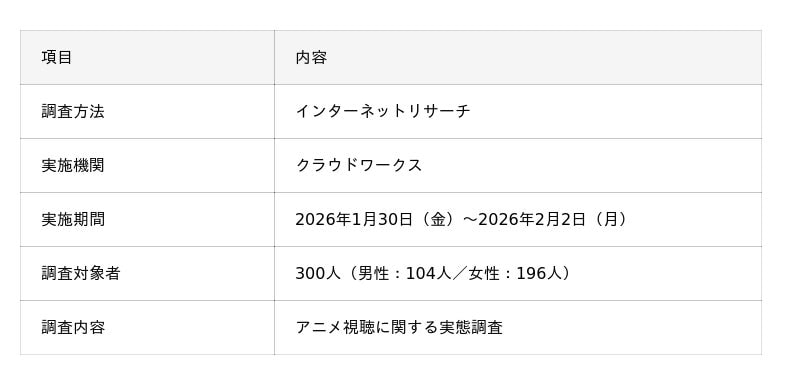 通信インフラ事業と地域振興事業を手掛ける株式会社ALL CONNECT(代表取締役社長:岩井 宏太/本社:福井県福井市)のグループ会社である株式会社25(本社:福井県福井市)が運営する動画配信(VOD)サービス情報メディア『おうちシネマ』(https://vod.kddi-hikari.com/)は、動画配信サービス(VOD)利用経験者300人を対象に「アニメ視聴に関する実態調査」を実施し、その結果を公開いたしました。