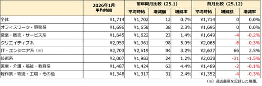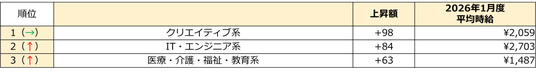 1月度の職種別/時給額ランキング