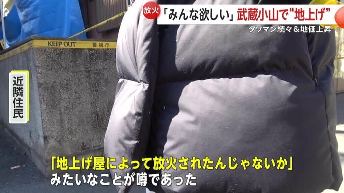一方で、今回の放火事件について近隣住民からは「『地上げ屋によって放火されたんじゃないか』みたいなことがうわさであった。『早く出て行ってくれ』とプレッシャーをかけたんじゃないかと」という声も聞かれた。