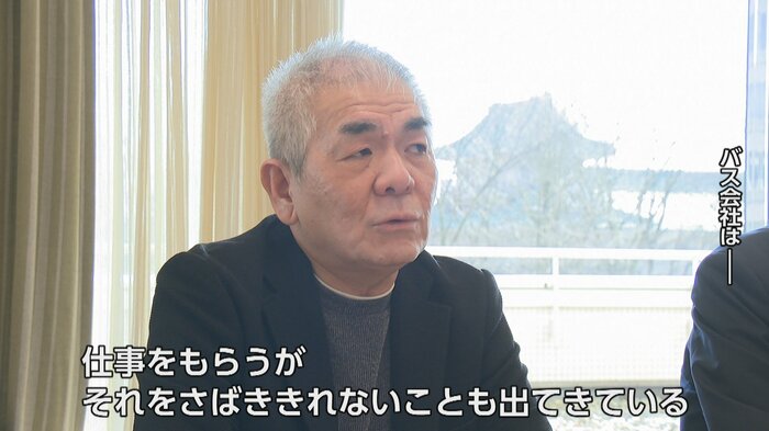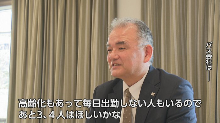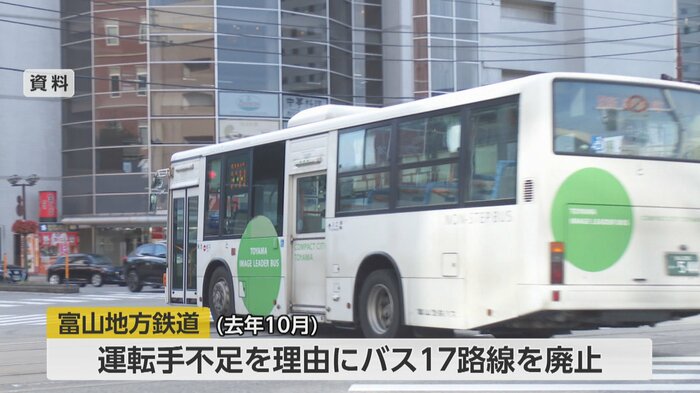 昨年10月、県内で多くの路線バスを担う富山地方鉄道が運転手不足を理由に17の路線を廃止した。バス会社の担当者は「仕事をもらうが、それをさばききれないことも出てきている。仕事があっても、人がいないから(バスを)動かせない」と悲痛な声を漏らす。現場では「高齢化もあって毎日出勤しない人もいるので、あと3、4人はほしいかな」という状況だ。