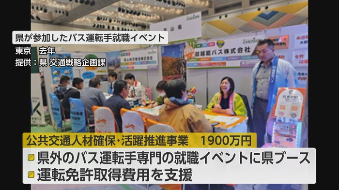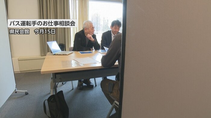 先日開催されたバスの運転手仕事相談会では、県内8つのバス会社が一堂にブースを出展。求職者に向けて「途中から入ってこられても、給料それなりにもらえるので」とアピールする光景が見られた。