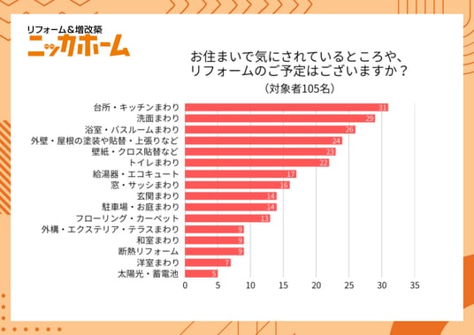 「お住まいで気にされているところや、リフォームのご予定はございますか?」の質問に対し、105名*の方に複数回答可の「リフォーム検討部位」のアンケートを実施した結果によると「台所・キッチンまわり」を検討いただいている方が共にもっとも多く31名、次いで「洗面まわり」を検討いただいている方が29名でした。