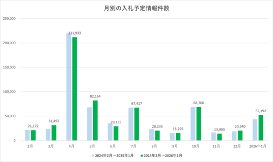 2026年1月の入札予定情報件数は52,192件でした。前月(2025年12月:20,340件)から31,852件の増加(前月比256.6%)となり、大幅に増加しました。前年同月(2025年1月:43,490件)と比較しても8,702件の増加(前年同月比120.0%)となっています。