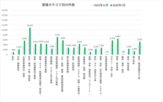 2026年1月の業種別入札件数では、多くのカテゴリで前月から増加が見られました。