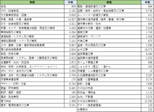 物品・機器系では、「家具・寝具・什器・備品等」が10,927件(前月比141.8%)、「文房具事務用品・図書」が5,635件(前月比158.2%)、「情報処理機器・ソフト及び業務」が7,141件(前月比139.0%)となりました。「事務機器及び業務」や「医療用機器・システム、医療・介護用品及び業務」でも増加が確認されています。