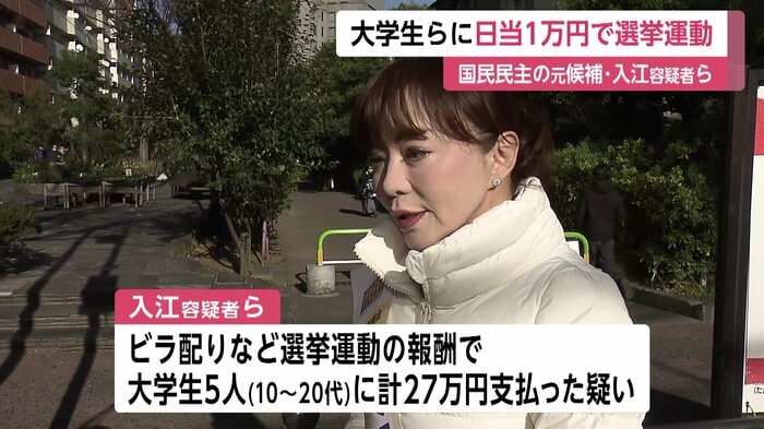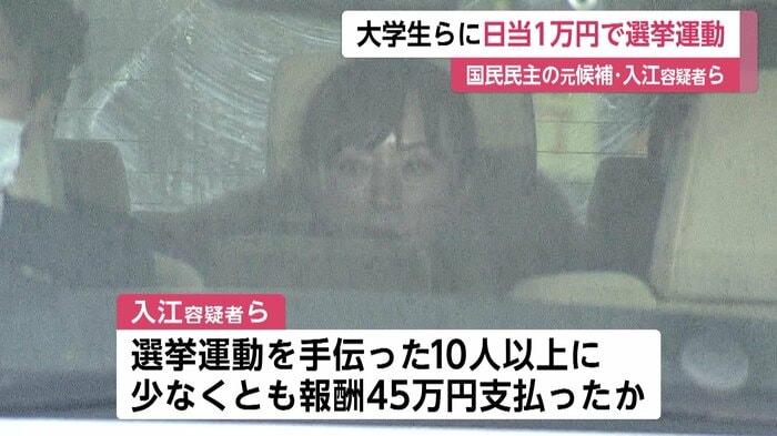 2月8日に投開票された衆院選に国民民主党の公認候補として立候補し、落選した入江伸子容疑者(63)とSNS運用会社の社長・菅原京香容疑者(25)ら3人は、ビラ配りなどの選挙運動の報酬として大学生(10~20代)5人に合わせて27万円を支払った疑いが持たれている。